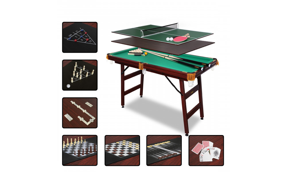 Бильярдный стол Fortuna Русская пирамида 4 фута 9 в 1 - это многофункциональный игровой стол, включающий 9 игр: русский бильярд, шашки, шахматы, нарды, настольный теннис (пинг-понг), кегли, шаффлборд, игральные карты и домино.