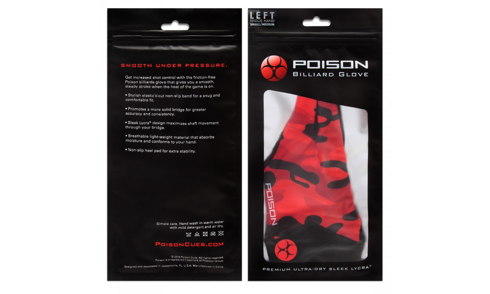 Бильярдная перчатка Poison Camo выполнена из лайкры премиального качества, обладающей свойством быстрого высыхания, что позволяет точно контролировать движения даже в самые напряженные моменты игры. Благодаря материалу, перчатка плотно облегает кисть руки и обеспечивает плавное скольжение шафта. Обладая уникальными свойствами и обеспечивая высокий уровень комфорта, Poison Camo позволяет получить значительные преимущества во время игры.